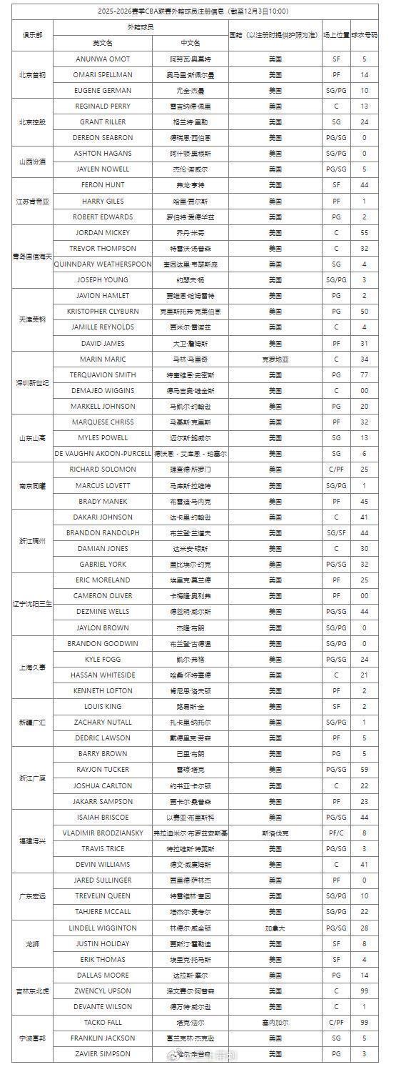 北京时间12月3日,CBA俱乐部杯将在本日拉开帷幕,CBA官方公布了各队外援注册情况,辽宁、上海等8队均是注册四外援,广东、北京等10队是注册3外援等,山西注册双外援,仅有欠薪的四川全华班未注册外援。