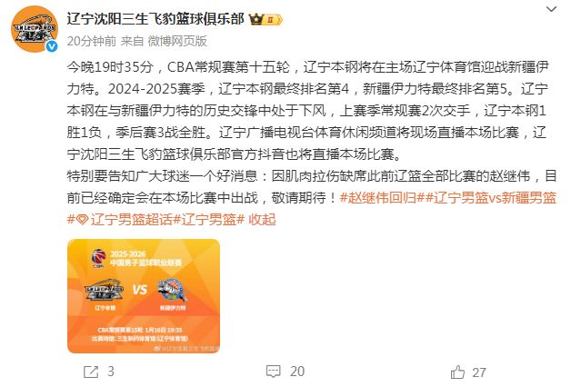 本赛季首次辽疆大战,赵继伟复出的表现令人期待,他能否率队取胜值得关注。
