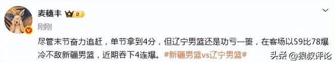 辽篮59-78不敌新疆,本赛季第二次遭遇四连败,近7场1胜6负。