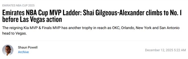 NBA杯MVP排名更新:亚历山大升至第一尼克斯双星杀入前五
