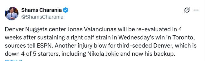 北京时间1月2日,名记Shams报道,据ESPN消息人士透露,丹佛掘金队中锋瓦兰丘纳斯在周四客场对阵猛龙队的比赛中右小腿拉伤,将在4周后接受复查。这对排名第三的掘金队来说无疑是又一次伤病打击,目前球队五名首发球员中已有四人缺阵,约基奇和他的替补瓦兰丘纳斯都受伤了。