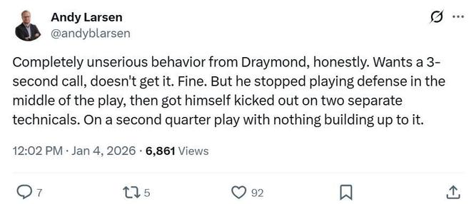 面对追梦这样的表现,爵士记者Andy Larsen公开发文批评道:“追梦的行为完全不负责任,实话实说,他想得到一个三秒违例的判罚,但没有得到,结果他就在比赛进行的情况下,直接放弃防守怒喷裁判,然后直接被罚出场,这一幕发生在第二节,还是在此前没有任何铺垫的情况下。”