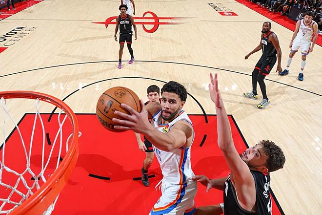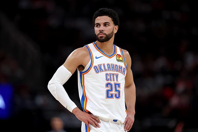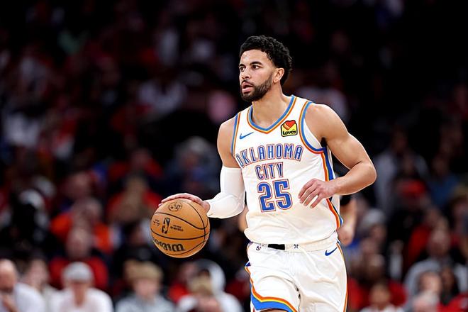本场比赛中,雷霆的替补后场新星阿杰-米切尔(Ajay Mitchell)的表现令人大跌眼镜。米切尔全场出场22分56秒,投篮10中7,三分线外4中3,得到了17分5篮板3助攻1抢断1盖帽的数据,还有1次失误,正负值为+9。米切尔在进攻端还是展现出了全面的得分能力,他的持球进攻能力和突破能力都相当不错,他也是展现出了不俗的传球能力和组织能力,他也是具备一定的支配球能力的。米切尔在防守端的表现同样是可圈可点的,同样是展现出了很强的个人防守能力。米切尔在本场比赛中又一次很好地扮演了后场大闸的角色,在场上的效果非常突出。雷霆能够比较顺利地取得这样一场大胜,也和米切尔的出色表现密切相关。