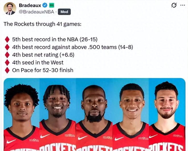 截止目前,火箭战绩26胜15负,常规赛半程位居西部第四,联盟第五。