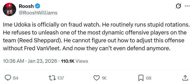 因此火箭播客主持人Roosh Williams在乌度卡给出理由后依旧怒喷到:“乌度卡已经被正式列入欺诈名单,他经常摆出愚蠢的轮转阵容,拒绝让队中最有进攻活力之一的谢泼德登场,没有范乔丹,他根本不知道如何调度进攻,甚至现在连防守也没有了。”
