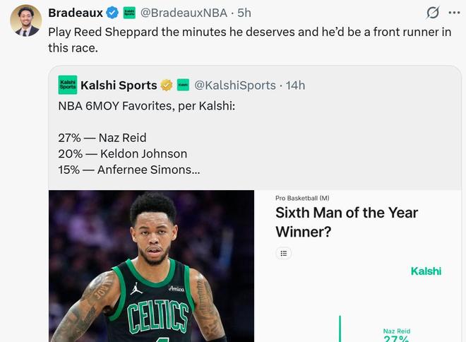 随后Bradeaux又迅速转发NBA本赛季超级第六人预测数据,其中谢泼德以9%概率排在第6,不及雷霆阿杰伊-米切尔(10%)、热火小海梅(13%)、凯尔特人安芬尼西蒙斯(15%)、马刺凯尔登约翰逊(20%)和森林狼纳兹里德(27%)。