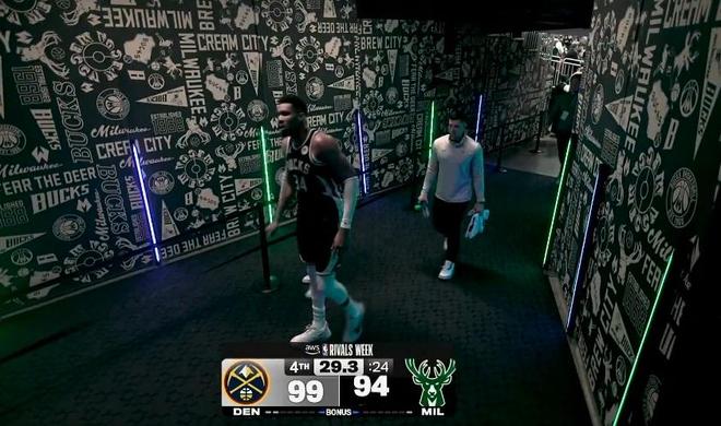 保护了自己全场,结果最后时候受伤,字母哥非常沮丧,默默就走回了更衣室。结果往更衣室走的时候,突然听到场上在欢呼,他又走回替补席坐在板凳席上看球。但是可以看到字母哥非常难受,捂着自己的脸很痛苦。