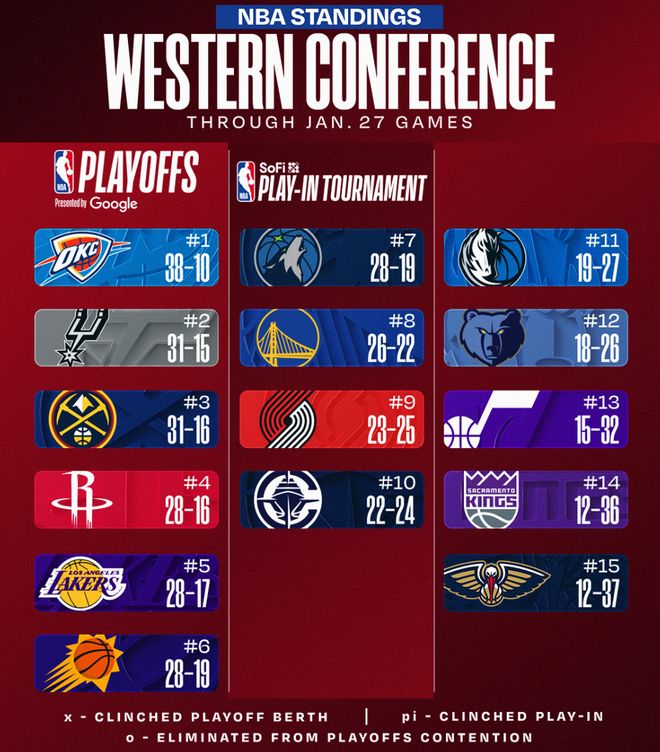 北京时间1月28日,NBA常规赛打完后,西部的格局再度发生了些许变化,超级残阵的太阳重返西部第六,森林狼掉回西部第七;开拓者爆冷不敌东部倒二的奇才,他们的胜场已经跟快船持平,因为快船拿到三连胜,快船摆脱西部第十只是时间问题。
