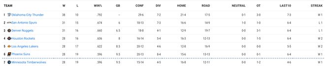 实际上大家会发现第一集团的差距并不大(除了雷霆),马刺只领先掘金0.5个胜场,掘金只领先火箭1.5个胜场,火箭只领先湖人0.5个胜场,湖人只领先太阳1个胜场,太阳与森林狼都是28胜19负。