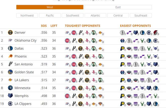 快船余下的36场比赛对手平均胜率仅为49.3%,排在西部倒数第六,换言之快船余下的赛程是西部第六轻松的,掘金余下的赛程最难,灰熊、勇士、独行侠、太阳作为快船冲击西部前六的竞争者余下的赛程都更难。