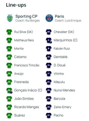巴黎客战葡萄牙体育:登贝莱、杜埃首发,维蒂尼亚出战