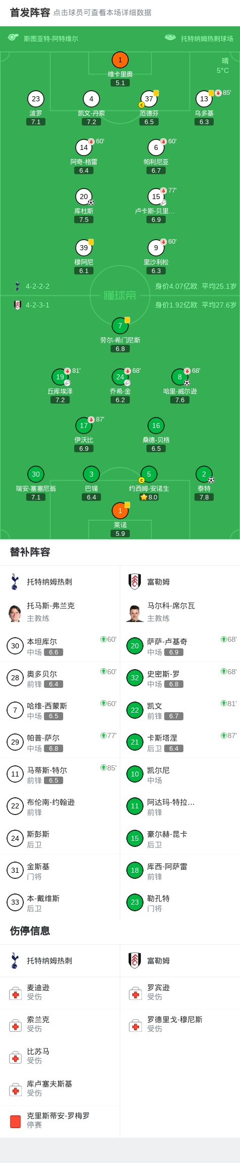 剑南春热刺12富勒姆,哈里威尔逊吊射,库杜斯破门难救主