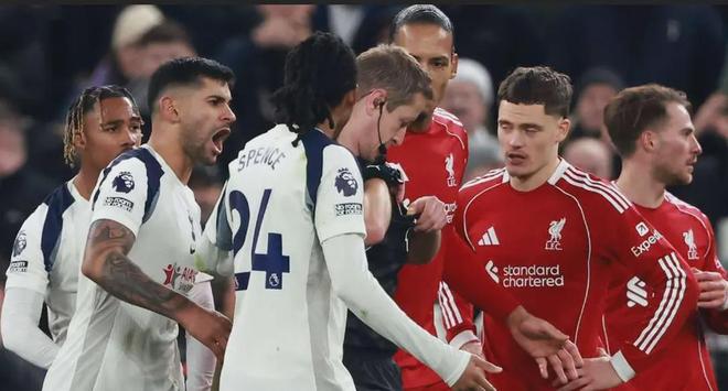 这场比赛的戏剧性,从第30分钟就注定拉满。热刺10号哈维·西蒙斯在逼抢中蹬踏范戴克小腿,主裁判先出示黄牌,经VAR介入后改判直红罚下。这本该是利物浦掌控全局的开始,却没想到成了“混乱模式”的启动键。补时阶段,罗梅罗拼抢后的附加动作吃到第二张黄牌,两黄变一红离场,热刺就此沦为9人作战。数据统计显示,这是2007年10月以来,首支在对阵利物浦的英超比赛中吃到两张红牌的球队,热刺用最鲁莽的方式,续写了对红军的悲情历史。