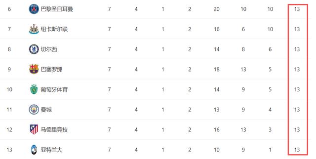 巴黎圣日耳曼13分10个净胜球,纽卡13分10个净胜球,切尔西13分6个净胜球,巴萨13分5个净胜球,葡萄牙体育13分5个净胜球,曼城13分4个净胜球,马竞13分3个净胜球,亚特兰大13分1个净胜球。