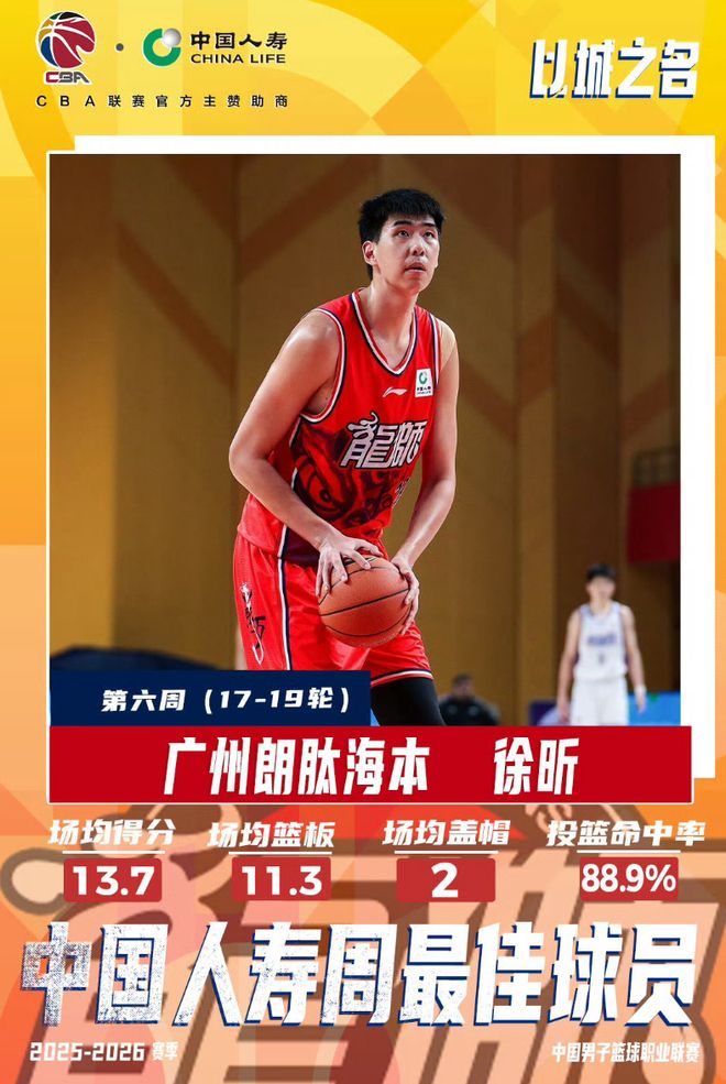 两天后,徐昕当选本赛季CBA常规赛第六周的周最佳球员。