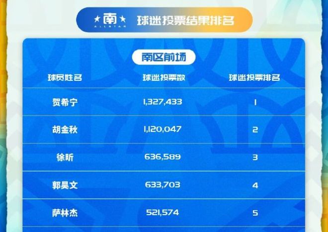 其实翻看票数统计,徐昕已经非常接近自己生涯首次全明星首发的席位,他的球迷选票有636589票 ,高居南区前场的第3,力压633703票的郭昊文。
