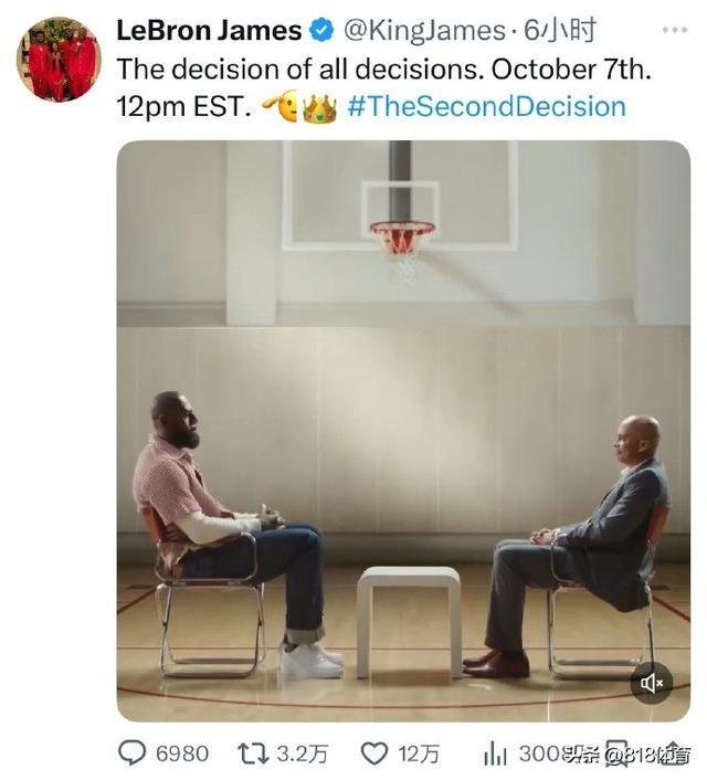 10月7日凌晨,湖人老大詹姆斯突然更新了推特动态,他写道:“所有决定中的决定,10月7日,美东时间中午12点。#决定2”换算成北京时间即明天凌晨0点。