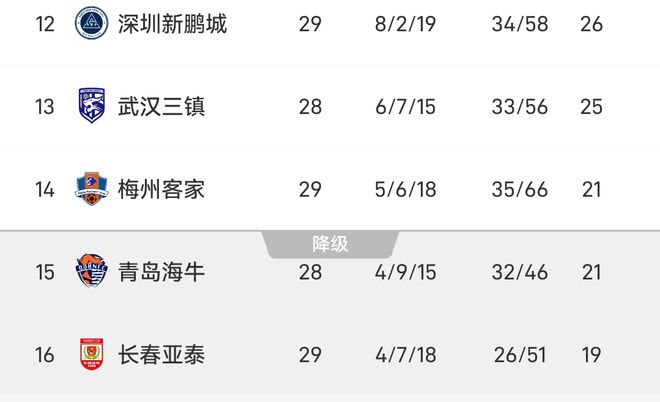 在本轮中虽然新鹏城不敌申花,三镇vs海牛的比赛还未进行,但随着亚泰输球、梅州战平,新鹏城和三镇分别高出降级区5分和4分。