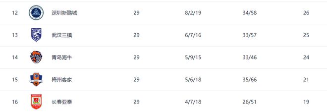 在第29轮,率先出战的深圳新鹏城客场0比1负于上海申花,长春亚泰主场0比4负于北京国安,梅州客家则2比2战平大连英博。